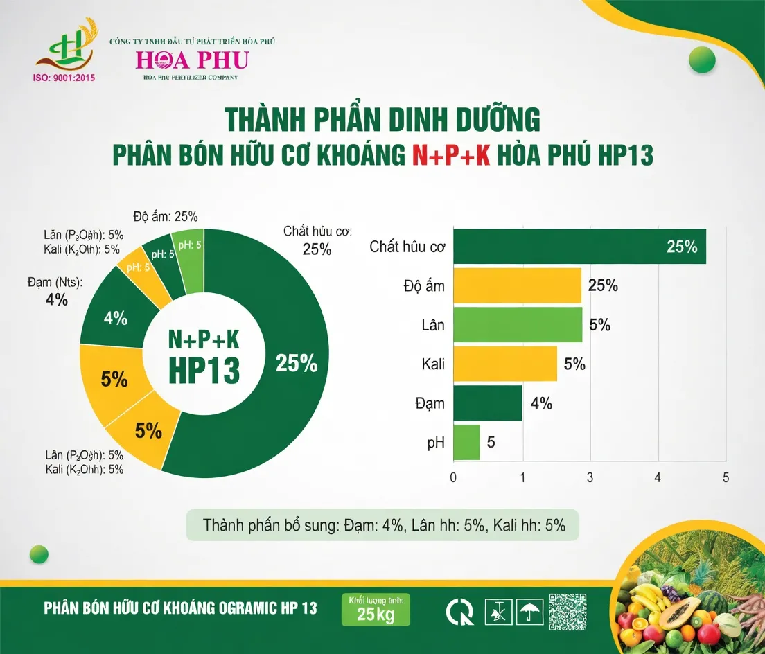 Phân bón hữu cơ khoáng N+P+K HP13 được thiết kế với bảng thành phần tối ưu: