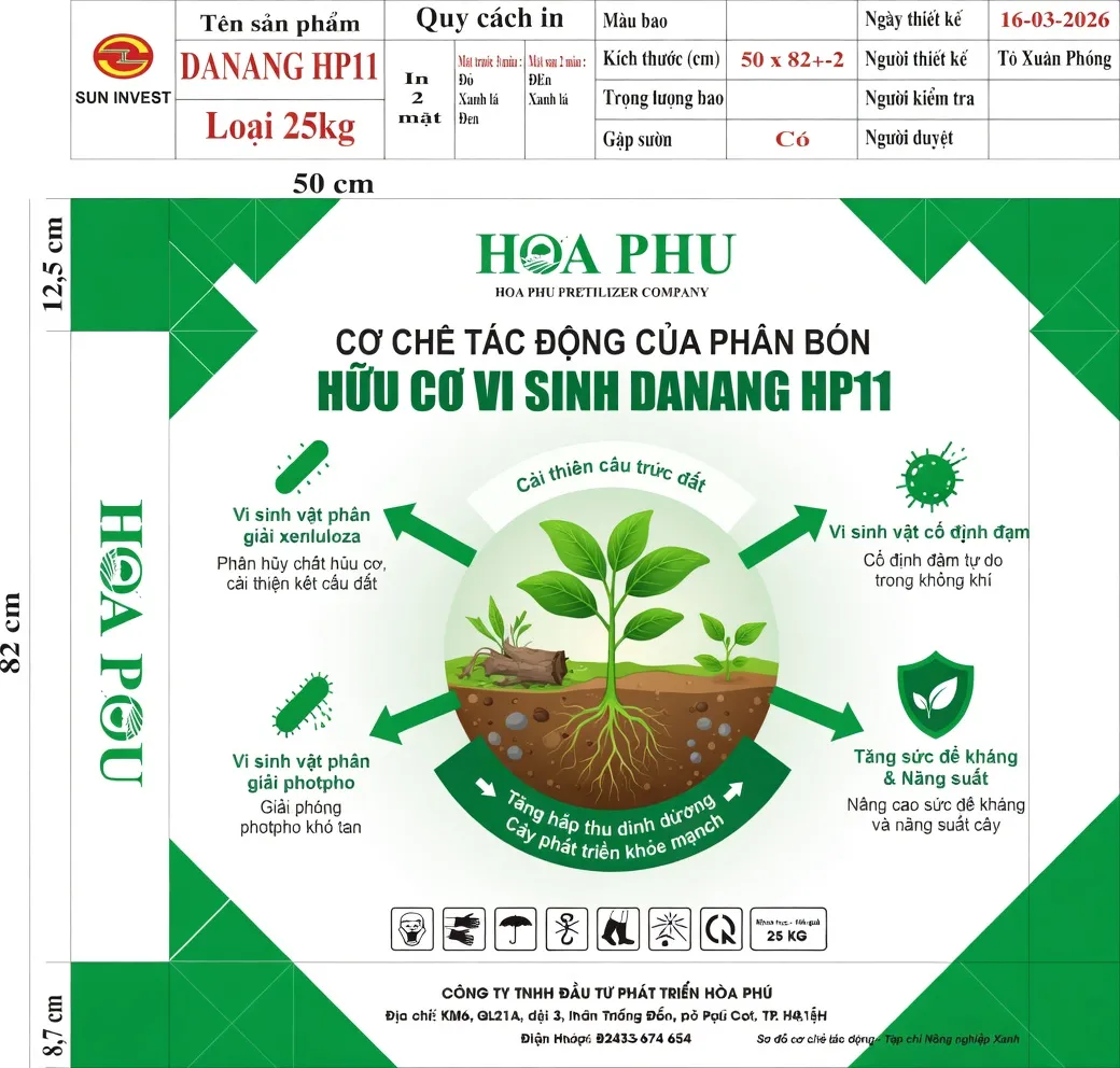 Trong bối cảnh nông nghiệp Việt Nam đang chuyển dịch mạnh mẽ sang hướng hữu cơ và sinh thái, phân bón hữu cơ vi sinh Danang HP11 của Công ty TNHH Đầu tư Phát triển Hòa Phú nổi lên như một sản phẩm chiến lược. Sản phẩm không chỉ cung cấp chất hữu cơ mà còn bổ sung trực tiếp các vi sinh vật có ích sống, giúp cải tạo đất từ gốc rễ, kích thích hệ vi sinh vật bản địa và nâng cao khả năng hấp thu dinh dưỡng của cây trồng. Đây là lựa chọn lý tưởng cho những ai mong muốn giảm dần phân hóa học, tăng chất lượng nông sản và hướng tới nông nghiệp bền vững lâu dài.